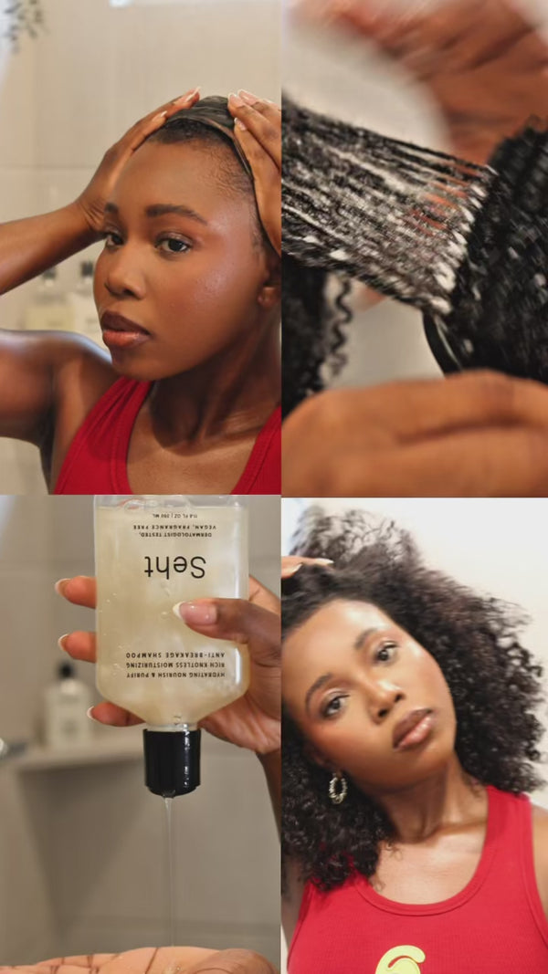 Begin with the Seht Hydrating Nourish & Purify Rich Knotless Moisturizing Anti-Breakage Shampoo then follow with Seht Nourishing, Most Intense Slip Anti-Breakage Deep Moisture All Purpose Conditioner.